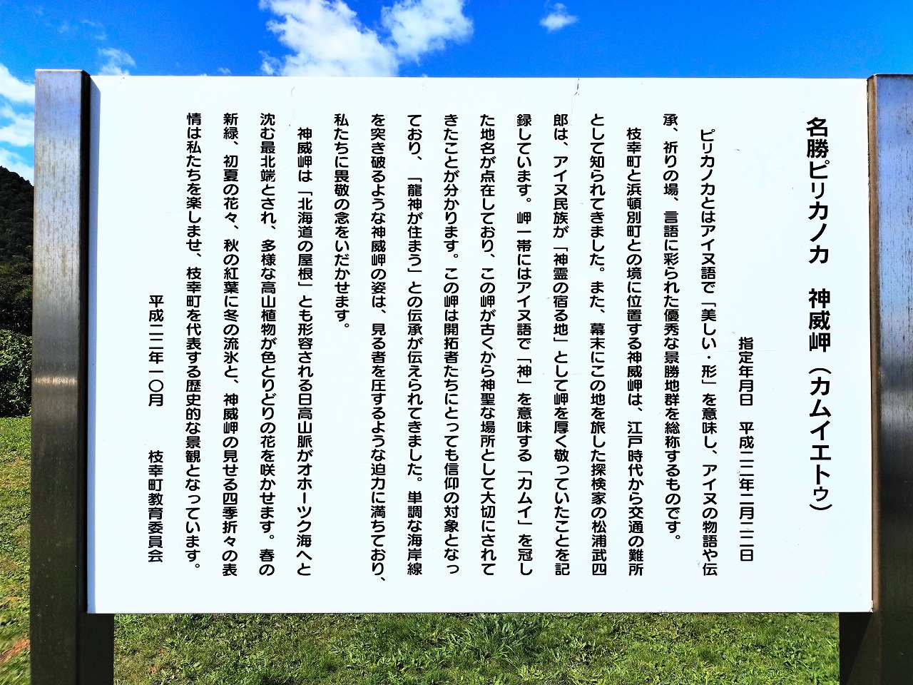 枝幸町と浜頓別町にまたがる岬で、「北オホーツク道立自然公園」の一部となっている北見神威岬