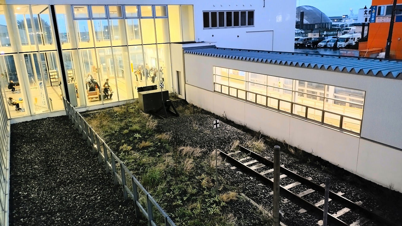 線路に向かってスマホを向ける人たちがいたので、何かあるのかなぁと見ていたところ、列車が到着。駅舎の2階から列車を見下ろすことができる。