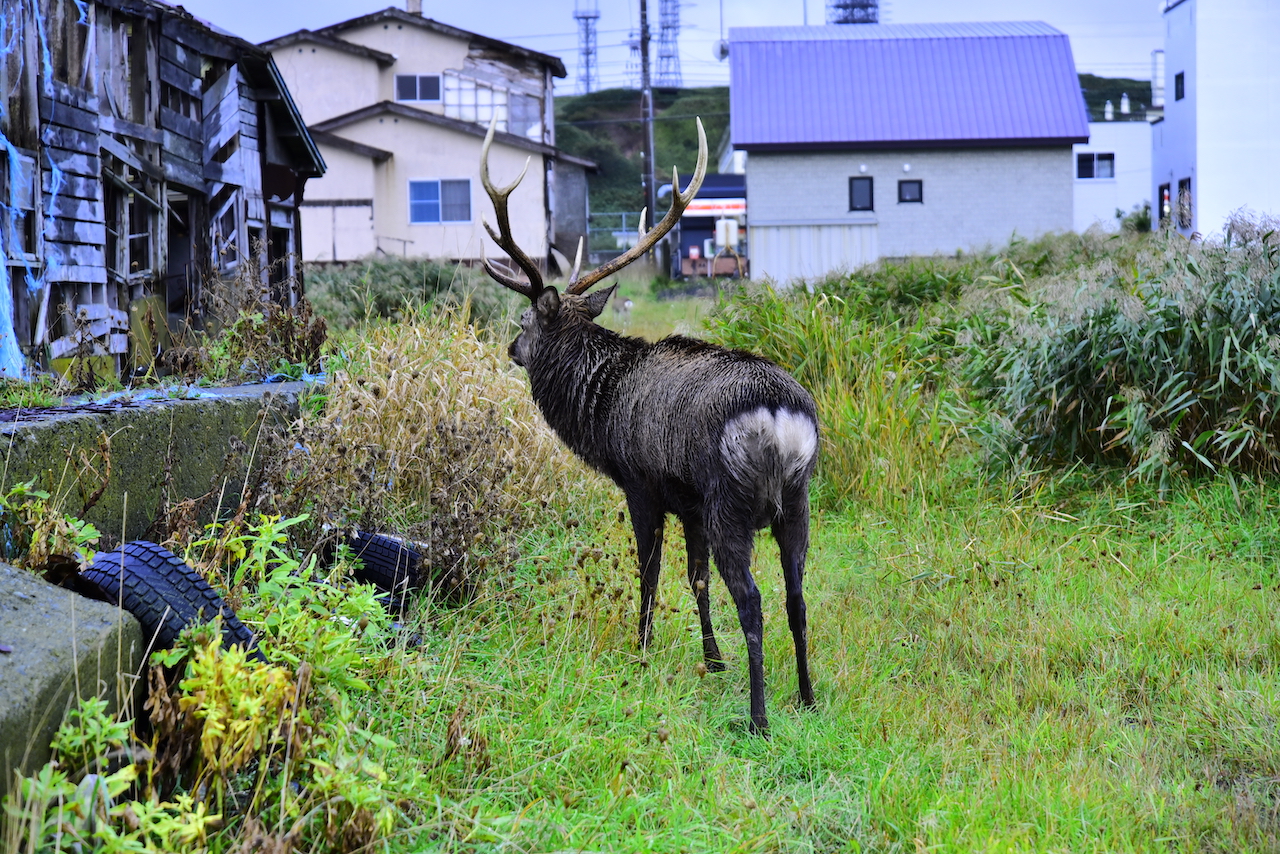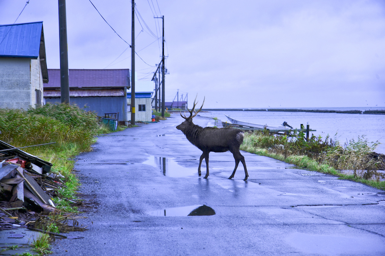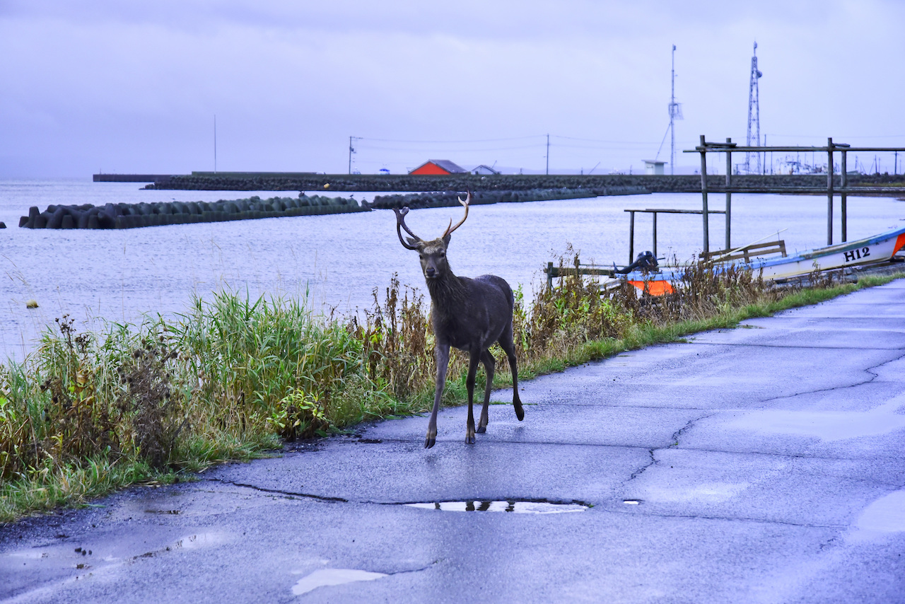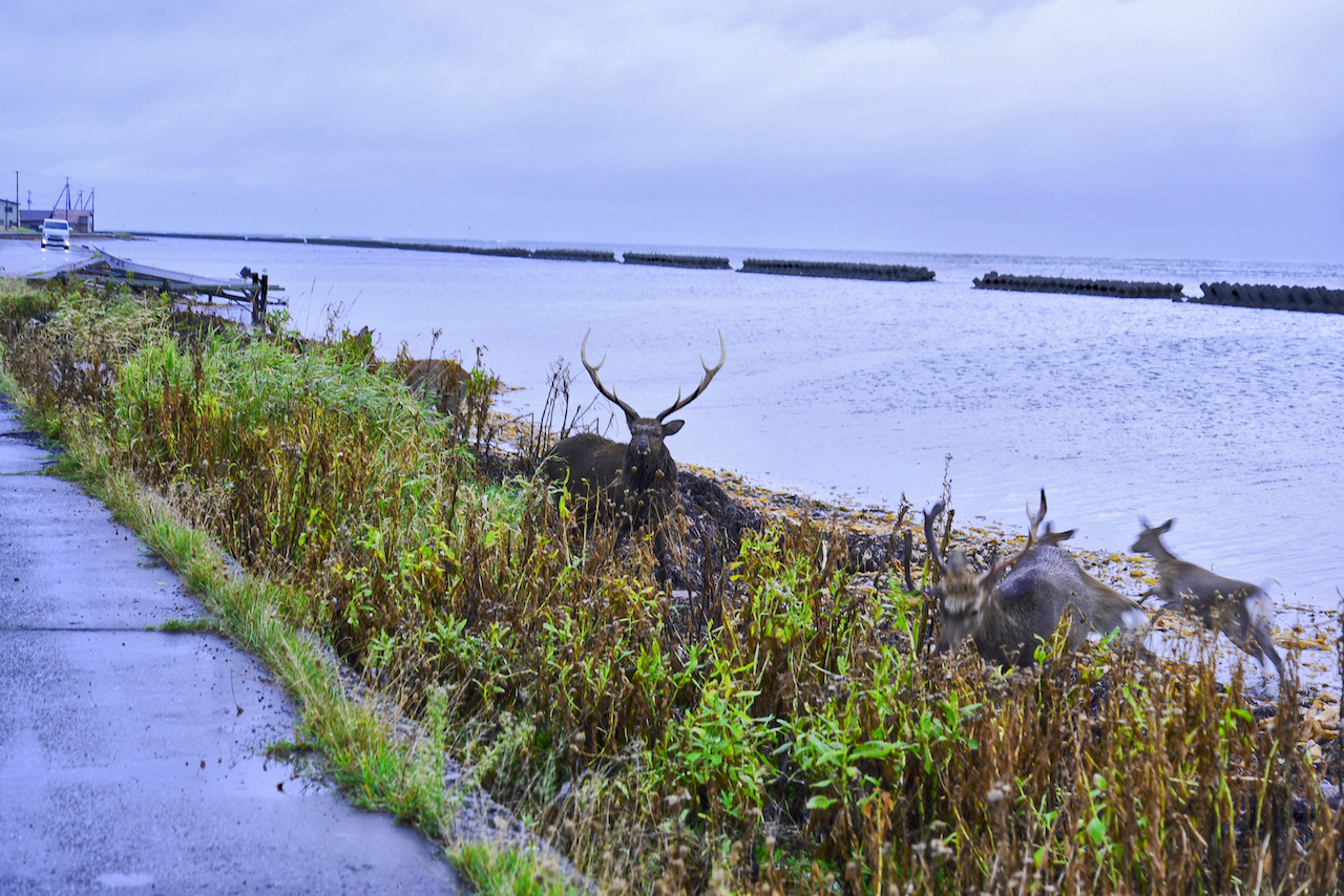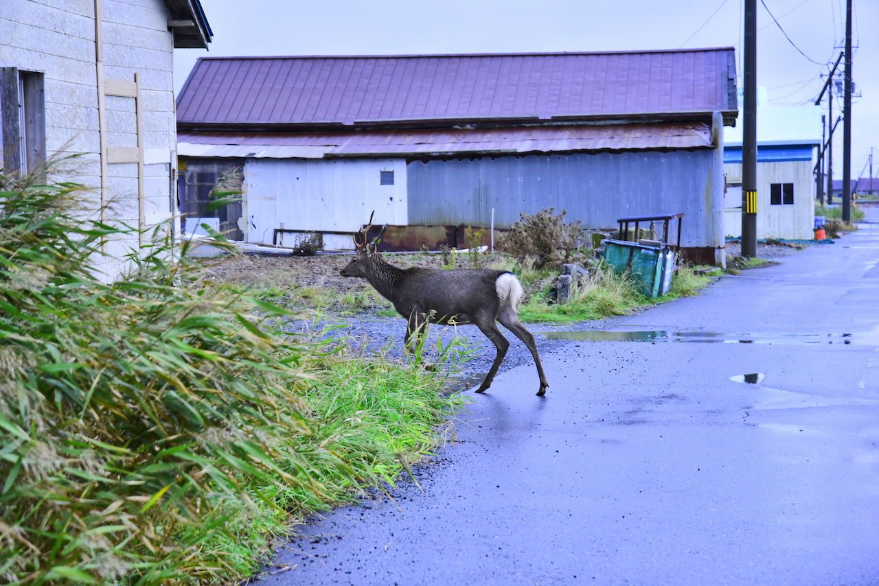 若い鹿たちが道路を横断し終えると、ボスがゆっくりと歩き出す。